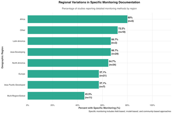 Regional Variations in Specific Monitoring Documentation. The percentage of studies reporting specific monitoring methods varied considerably across regions (Figure 11). Africa demonstrated the highest rate of specific monitoring documentation (80.0%; 4 of 5 studies), followed by Other regions (72.2%; 13 of 18 studies) and Asia—Developing (66.7%; 16 of 24 studies). Latin America showed specific monitoring in 66.7% of studies (2 of 3 studies), while North America reported specific monitoring in 64.7% of studies (22 of 34 studies). Asia-Pacific— Developed and Europe each documented specific monitoring in 57.1% of studies (4 of 7 studies and 12 of 21 studies, respectively). Multi-Region/Global studies showed the lowest rate of specific monitoring documentation at 45.5% (5 of 11 studies).