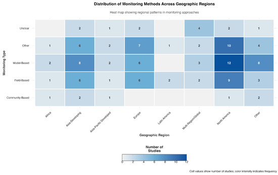 Distribution of Monitoring Methods by Region: Model-based monitoring was most prevalent in North America (n = 12), followed by Asia—Developing (n = 8) and Other regions (n = 8). Europe showed equal distribution between model-based and field-based approaches (n = 6 each). Field-based monitoring was most common in the North America (n = 9) and Asia—Developing regions (n = 6). Community-based monitoring appeared infrequently across all regions, with Asia—Developing (n = 2) and Other regions (n = 2) showing the highest counts (Figure 12).