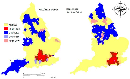LISA Maps of Productivity and Affordability. Maps of Local Indicators of Spatial Association. Left: Gross Value Added/Hour Worked. Right: House Price–Earnings Ratios—Pre-COVID-19 Period.