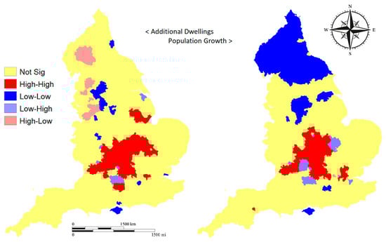 LISA maps of Additional Dwellings and Population Growth. Maps of Local Indicators of Spatial Association. Left Additional Dwellings. Right Population Growth—Pre-COVID-19 period.