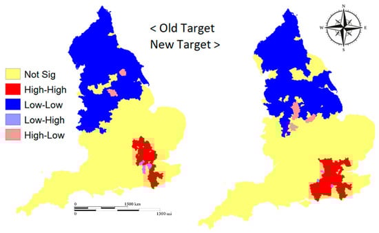 LISA maps of the Old and New Targets for England. Maps of Local Indicators of Spatial Association. Left: Old Targets. Right: New Targets.