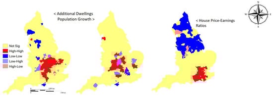 As noted, the distribution of additions is not in agreement with that of HPERs. There is no agreement between clusters of population growth and HPERs (−0.0178 [0.662]) even at category level. Gray [] tracks the migration of those aged 0–4, 20–24, 25–29 and 30–39, amongst others. The movements of 20–24-year-olds is one of in-migration to London, most likely in the early stage of a career, consistent with the first job within an escalator region. The 30–39-year-olds mirror the migration patterns of infants which have a clear pattern of movement out of London to the Greater Southeast/South Midlands. This is posited to be associated with forming a family unit, the first child, lower density living, and house purchase. It is concluded that the pattern of child movement is not necessarily related to affordability. Rather, back-commuting seems to be the locational driver [].
