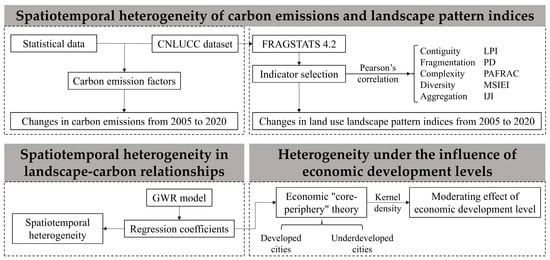 Based on land-use remote sensing images covering 300 cities in China from 2005 to 2020, spatiotemporal variations in land-use quantity and conversion processes were systematically investigated over the past 15 years. The carbon emission factor method was employed to calculate carbon emissions/sequestration of different land-use types, thereby deriving the net carbon emissions for each city. Landscape pattern indices were selected from the following five dimensions: contiguity, fragmentation, complexity, diversity, and aggregation. After Pearson’s correlation coefficient testing, landscape pattern indices for each city from 2005–2020 were computed. The Ordinary Least Squares (OLS) model was integrated into the Geographically Weighted Regression (GWR) model to examine the impact of landscape patterns on carbon emissions. Incorporating the economic “core-periphery” theory, the study area was categorized into developed and underdeveloped cities. Kernel density analysis was applied to investigate how economic development levels moderate the effects of landscape patterns on carbon reduction. It should be noted that the CNLUCC dataset adopted in this study has the following two inherent limitations: (1) the 1-km resolution may lead to inadequate identification of small-scale landscape characteristics within urban areas; (2) the modified classification system employed for the 2020 data may introduce continuity deviations when compared with previous years. The research framework is illustrated in Figure 2.