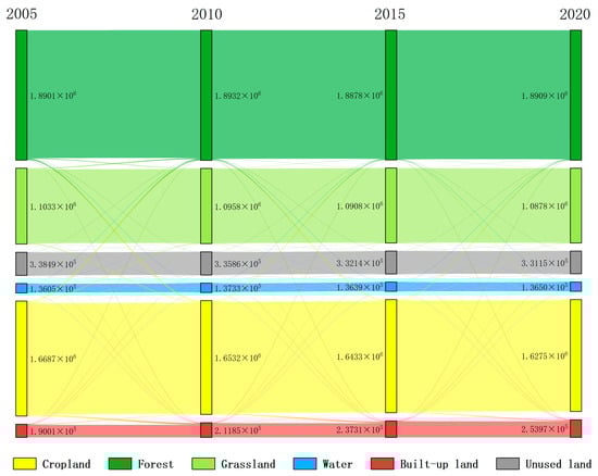 Sankey diagram of land-use transformation from 2005 to 2020.