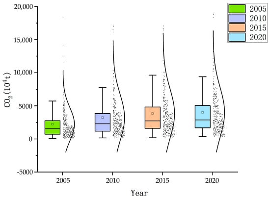 As shown in Figure 4, urban carbon emissions have rapidly increased overall, with a growing number of cities exceeding the 5 × 107 t emission threshold. The boxplot reveals the data distribution characteristics, displaying quartiles (upper and lower box boundaries) and outliers (points beyond the whiskers). Temporal analysis reveals the following three key trends: first, the overall increase in box height (interquartile range) indicates increasing variability in emission levels, reflecting widening disparities among cities; second, a slight reduction in box height between 2015 and 2020 suggests a potential convergence trend; and third, the persistent presence of outliers across all years represents cities with exceptionally high or low emissions, with their changing distribution possibly reflecting differential progress in emission control—with some cities making notable improvements while others face mounting challenges. Most significantly, the consistent upward shift in median values (horizontal lines within boxes) year after year confirms that the majority of cities experienced continuous growth in carbon emissions throughout the study period.