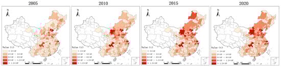 As we hypothesized, carbon emissions exhibited significant spatiotemporal heterogeneity from 2005–2020. Figure 5 illustrates the spatial distribution and temporal evolution of carbon emissions across China’s 300 cities for the years 2005, 2010, 2015, and 2020. The emission levels are categorized into five distinct classes, with a color gradient from light to dark representing increasing emission intensity; the darkest red hue signifies the highest emission category. Spatially, the patterns reveal the following pronounced regional disparities: coastal eastern China and central regions consistently present elevated emission levels, predominantly represented by dark red and red zones, indicative of their intensive economic activities and rapid industrial development, which drive substantial energy consumption and, consequently, carbon output.