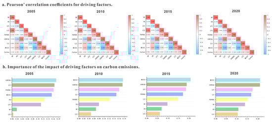 This study first conducted a Pearson correlation analysis to examine the intervariable relationships and their directional associations (Figure 6). The results revealed statistically significant correlations between LSI and NP, LPI and CONTAG, MSIEI and LPI, and MSIEI and CONTAG, but minimal correlations between NP/LSI and carbon emissions across most study years. Consequently, from the original eight landscape pattern indices, we systematically selected five indicators that exhibited strong correlations with carbon while maintaining low multicollinearity. These selected metrics, PD (patch density), LPI (largest patch index), PAFRAC (perimeter-area fractal dimension), IJI (interspersion and juxtaposition index), and MSIEI (modified Simpson’s evenness index), quantify key dimensions of land-use morphology, including fragmentation, adjacency, complexity, aggregation, and spatial evenness characteristics, respectively.