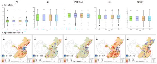 Figure 7 illustrates the temporal trends of the land-use landscape pattern indices in the study area. The boxplot (Figure 7a) shows the distribution characteristics and temporal variations in these indices. Overall, from 2005 to 2020, the median and quartile values of all indices remained relatively stable, indicating consistent overall distribution patterns. The LPI and MSIEI exhibited the highest rates of change, with average annual changes of −3.60% and 3.20%, respectively, followed by the IJI (1.76%) and PD (1.55%), whereas the PAFRAC showed the most stable trend, with an average change of only −0.18%. Notably, the LPI and MSIEI values were concentrated predominantly within the interquartile ranges without significant outliers, suggesting relatively uniform spatial distributions across cities.