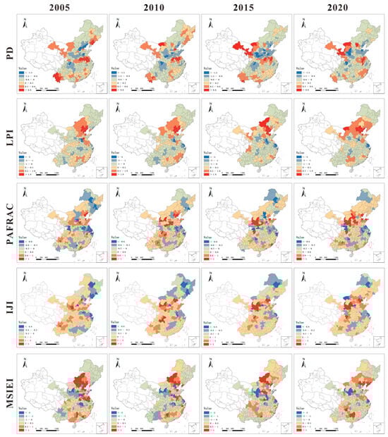 As we hypothesized, these indices demonstrated marked spatial heterogeneity in their changes from 2005–2020 (Figure 7b). Using Jenks natural breaks classification, we categorized the change rates of each index into six levels. Most cities presented positive PD change rates, indicating increasing landscape fragmentation, except for Shandong Province and adjacent areas, where negative values suggested reduced fragmentation and more consolidated patches. Negative LPI changes prevailed, reflecting decreased patch adjacency. The PAFRAC changes, although predominantly negative, had minimal absolute values (−0.18%), suggesting slightly reduced but generally stable shape complexity. Positive IJI changes in most cities indicated more interspersed patch distributions and lower aggregation, in contrast to Shandong, Jiangsu, and neighboring cities, which showed increased aggregation. The changes in the MSIEI ranged from 0 to 7.88%, implying moderately enhanced evenness in patch-type distribution across most urban landscapes. This finding is consistent with our initial hypothesis.