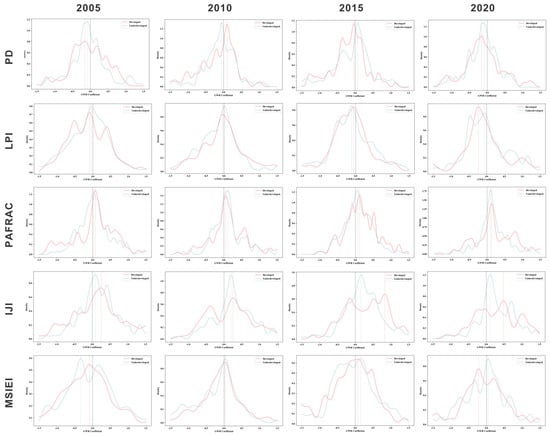 LPI analysis revealed coefficient peaks to the left of zero for UCs across most years, reflecting consistent negative relationships. DCs showed even stronger leftward peak positions, confirming that greater patch adjacency more effectively reduces emissions in developed cities. Notably, from 2005 to 2020, DCs’ peaks transitioned from being lower to higher than UCs’ peaks, with distributions evolving from multimodal to unimodal, indicating increasing consensus about the negative emission effects of LPI in developed areas. After 2015, the emission reduction effect of DCs’ LPI showed marked enhancement, which coincides with the implementation timeline of the carbon emission trading pilot program covering industrial land.