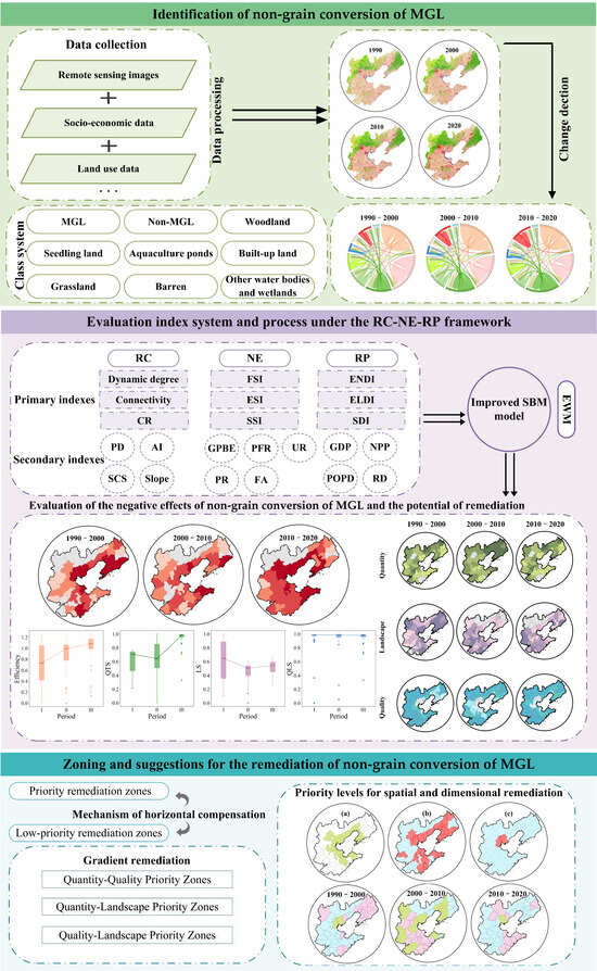 The Bohai Rim (BR) is a complex region in China that is densely populated, economically active, and rich in agricultural resources [18]. However, with the acceleration of urbanization, the MGL in this region has experienced significant losses, causing increasingly serious food security issues. According to existing studies, between 2000 and 2021, in China’s economically developed eastern coastal regions, the contribution to non-grain conversion was approximately 20.8% in the Bohai Rim region, 10% in the Yangtze River Delta, and 1.9% in Guangdong Province. By comparison, the Bohai Rim region’s contribution to China’s overall non-grain conversion was significantly higher than that of the other eastern coastal regions. Therefore, this study selects the Bohai Rim region as a case study area, given its strong representativeness. The main research procedure is as follows (Figure 1): (1) First, the MGL areas converted to non-grain uses were identified by detecting changes in land use types. (2) Then, the RC-NE-RP evaluation framework was established based on the theory of the production function in economics, and the negative effects of non-grain conversion of MGL in the BR region and the remediation potential of the MGL converted to non-grain uses in the region were quantitatively evaluated using an improved SBM model. (3) Finally, the MGL converted to non-grain uses was divided into remediation zones through cluster analysis [19]. The purpose is to provide a scientific basis for the remediation and protection of cultivated land in the BR region and the optimization of regional land resource allocation and to provide theoretical support for developing and implementing land use controls and land protection policies.