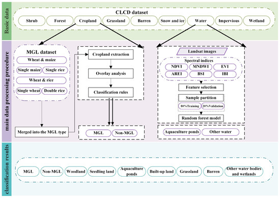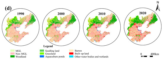 Therefore, the non-grain lands converted from MGL in the study area are classified into the following seven types based on the characteristics of non-grain conversion: built-up land, cash crop land, artificial wetland, aquaculture pond, seedling land, and wasteland. The data collected from the study area were processed according to the procedure detailed below. First, the required land types were extracted by performing cloud removal, median synthesis, and random forest classification on the remote sensing images. Subsequently, reclassification and raster calculation were performed based on the land use data. Finally, the land use classification system for the BR region was reconstructed (Table 2). The nine classes of land under the new classification system are MGL, non-MGL, woodland, seedling land, grassland, aquaculture ponds, barren, built-up land, and other water bodies and wetlands (Figure 3).