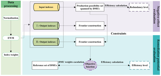 Here, m is the number of input indexes, s is the number of output indexes, and are the values of the input and output indexes of the current decision-making unit, is the weighting factor of the decision-making unit j, and are the redundant variables for insufficient input and excess output, and and are the weights of input and output indexes determined by EWM.