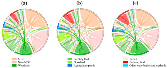 During the period from 1990 to 2020, the BR region experienced a rapid process of conversion of MGL to non-grain land. The land use transition matrixes (Figure 5) show that, during the period from 1990 to 2020, the total area of MGL in the BR region decreased significantly, while the total area of built-up land, aquaculture ponds, and seedling land increased significantly.