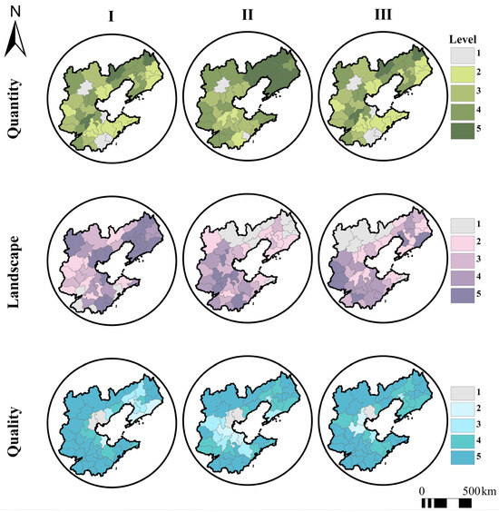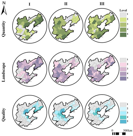 Spatial evolution characteristics of the remediation potential of non-grain land converted from MGL: I—1990–2000; II—2000–2010; III—2010–2020 (Numbers 1–5 represent the levels of remediation potential in ascending order).