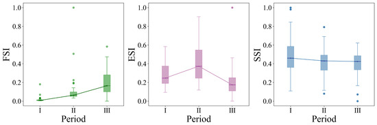 Temporal evolution characteristics of FSI, ESI, and SSI: I—1990–2000; II—2000–2010; III—2010–2020.