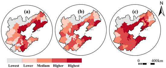 The negative effects of non-grain conversion of MGL in the BR region show significant spatial differences, generally exhibiting a trend of increase from Beijing–BER to the southeast hinterland (Figure 10). During the period from 1990 to 2000, the negative effects of non-grain conversion of MGL varied greatly from one area to another in the BR region. Specifically, Tianjin and its surrounding areas experienced significant negative effects of non-grain conversion, while most areas in Hebei Province experienced moderate or low negative effects of non-grain conversion. The negative effects of non-grain conversion of MGL in Liaoning Province varied significantly from one area to another, with the Liaodong Peninsula subjected to relatively strong negative effects and the northern areas experiencing negative effects to varying extents. The negative effects of the non-grain conversion of MGL in Shandong Province show a spatial pattern featuring stronger negative effects in the middle and weaker negative effects on both flanks. During the period from 2000 to 2010, the negative effects of non-grain conversion of MGL spread significantly in the Beijing–Tianjin–Hebei region and intensified in many areas of central and southern Hebei, showing a trend of intensification within the region; the original severe negative effects on many areas in Liaoning Province weakened, the range of negative effects caused by non-grain conversion of MGL in Shandong Province further expanded, and the areas subjected to strong negative effects (high-value areas) gradually shifting to coastal cities represented by Yantai City. During the period from 2010 to 2020, the negative effects of non-grain conversion of MGL in the BR region generally showed an upward trend, and large high-value areas appeared in the Beijing–Tianjin–Hebei region, and the negative effects were highly concentrated in space; the overall level of such negative effects in Liaoning Province rebounded. Almost all areas of Shandong Province turned into high-value areas, indicating that Shandong Province experienced the most severe negative effects of non-grain conversion of MGL.