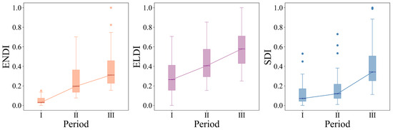 Temporal evolution characteristics of ENDI, ELDI, and SDI: I—1990–2000; II—2000–2010; III—2010–2020.