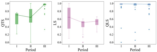 During the period from 1990 to 2020, the remediation potential of non-grain land converted from MGL in the BR region changed significantly over time (Figure 11 and Figure 12). In terms of quantity, the median of the remediation potential of non-grain land converted from MGL was 0.706 during the period from 1990 to 2000, slightly decreased to 0.643 during the period from 2000 to 2010, and rose sharply to 0.98 during the period from 2010 to 2020. In terms of landscape pattern, the median of remediation potential was 0.645 during the period from 1990 to 2000, slightly decreased to 0.507 during the period from 2000 to 2010, and slightly rebounded to 0.546 during the period from 2010 to 2020. In terms of quality, the remediation potential of non-grain land converted from MGL remained stable at high levels above 0.98.