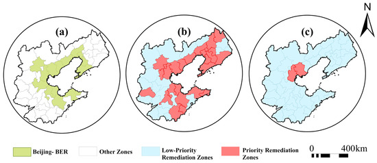 Zoning results with priority levels for spatial remediation: (a) Scope of Beijing–BER; (b) zoning results from the perspective of negative effects; (c) zoning results from the traditional perspective of resource security.