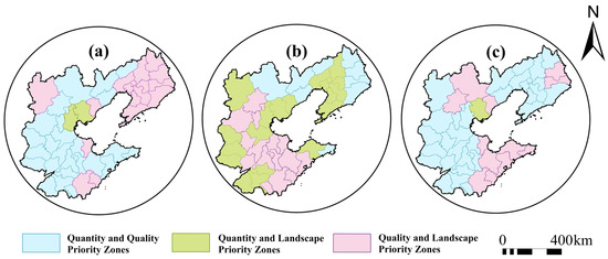 In terms of non-grain land remediation methods, based on the evaluation results in respect to the remediation potential of non-grain land converted from MGL in the BR region, the priority levels for dimensional remediation of non-grain land converted from MGL in the region were determined from the perspective of resource costs and inputs, and such non-grain land was divided into three types of zones, including Quantity–Quality Priority Zones, Quantity–Landscape Priority Zones, and Quality–Landscape Priority Zones. During the period from 1990 to 2000, the Quantity–Quality Priority Zones included most areas of Hebei Province and Shandong Province, the Quantity–Landscape Priority Zones only included Tianjin and Tangshan, and the Quality–Landscape Priority Zones were mainly concentrated in the Liaodong Peninsula and its surrounding areas. During the period from 2000 to 2010, the scope of the Quantity–Quality Priority Zones shrank, the scope of the Quantity–Landscape Priority Zones expanded, some areas of the Liaodong Peninsula and some cities in southern Hebei Province, including Handan City and Xingtai City, were transformed from Quantity–Quality Priority Zones to Quantity–Landscape Priority Zones, and the Quality–Landscape Priority Zones were mainly concentrated in Shandong Province and cities in central Hebei Province. During the period from 2010 to 2020, the scope of the Quantity–Quality Priority Zones gradually expanded, and northern Hebei Province, the Jiaodong Peninsula, and its surrounding areas gradually became Quality–Landscape Priority Zones (Figure 15).