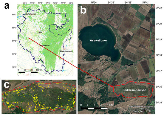 The Berkazan-Kamysh peatland: (a) location of the study area in the Republic of Bashkortostan; (b) location of the Berkazan-Kamysh peatland (boundary is marked in red); (c) location of georeferenced points selected for mapping (marked in yellow).
