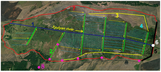 Hydrography scheme of the Berkazan-Kamysh peatland. The following elements of the drainage network are marked: 1 (blue line)—main channel, 2 (green lines)—transport channels, 3 (yellow lines)—upland-catching channels, 4 (light blue thin lines)—drainage channels, 5 (black line)—dam, 6 (white circle)—installation of automatic spillway, 7 (red line)—peatland boundary, 8 (pink circles)—springs. Yellow arrows show the direction of water flow.