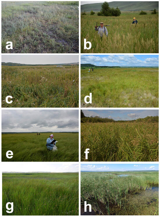 Investigated plant communities: (a)—salt-marsh communities; (b)—wet meadows with Calamagrostis epigeios; (c)—Festuca regeliana-forb meadows; (d)—Festuca regeliana + Hordeum nevskianum wet meadows, var. typicum; (e)—sedge communities with Carex acuta; (f)—common reed communities with Phragmites australis; (g)—tuber-reed communities with Bolboschoenus maritimus; (h)—cattail communities with Typha angustifolia.