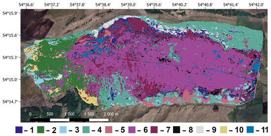Different types of plant communities and sites with open water in the Berkazan-Kamysh peatland: 1 (Figure 3a)—salt-marsh communities; 2 (Figure 3b)—wet meadows with Calamagrostis epigeios; 3 (Figure 3c)—Festuca regeliana-forb meadows; 4 (Figure 3d)—Festuca regeliana + Hordeum nevskianum wet meadows, var. typicum; 5 (Figure 3e)—sedge communities with Carex acuta; 6 (Figure 3f)—common reed communities with Phragmites australis; 7 (Figure 3g)—tuber-reed communities with Bolboschoenus maritimus; 8 (Figure 3h)—cattail communities with Typha angustifolia; 9—Festuca regeliana + Hordeum nevskianum meadows, var. Artemisia austriaca; 10—complex type of woody-shrub vegetation; 11—open water.
