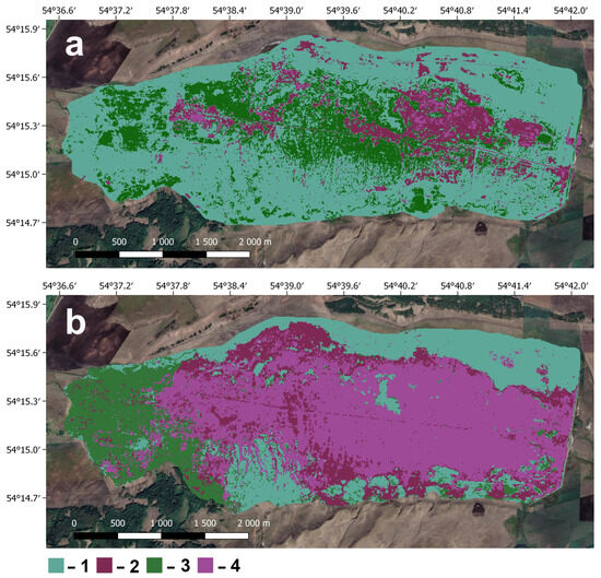 Distribution of the main types of plant communities in the Berkazan-Kamysh peatland: (a)—before rewetting [55,56] and (b)—after rewetting: 1—saline meadows (after rewetting: Festuca regeliana + Hordeum nevskianum wet meadows, Festuca regeliana + Hordeum nevskianum + Artemisia austriaca wet meadows, salt-marsh communities), 2—hydrophilic reed–sedge communities with tuber-reeds (after rewetting: tuber-reed communities with Bolboschoenus maritimus, sedge communities with Carex acuta), 3—slightly saline wet meadows (after rewetting: wet meadows with Calamagrostis epigeios, Festuca regeliana-forb meadows), 4—reed–cattail communities (after rewetting: common reed communities and cattail communities).