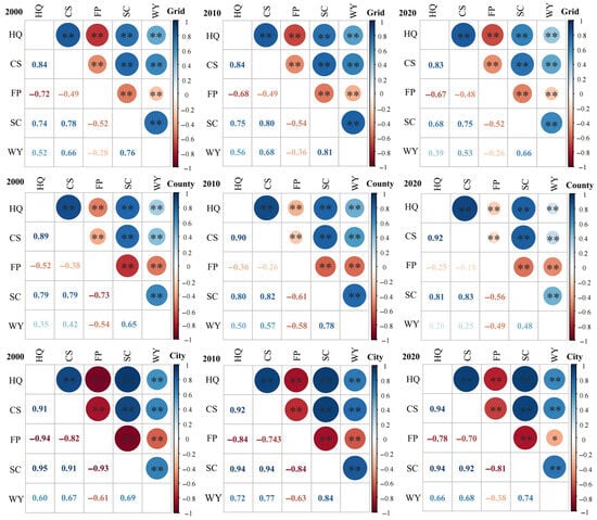 - At the county scale, HQ and CS exhibited the most prominent synergistic relationship (r = 0.92, p < 0.01), while FP showed a weak trade-off with each of them, with the minimum correlation coefficient reaching −0.18 (p < 0.01). The synergistic relationship between CS and SC exhibited obvious spatial aggregation characteristics. The explanatory power of both single and interactive socio-ecological factors had increased, among which the average annual precipitation and average annual temperature contributed the most, with values of 0.893 and 0.782, respectively.