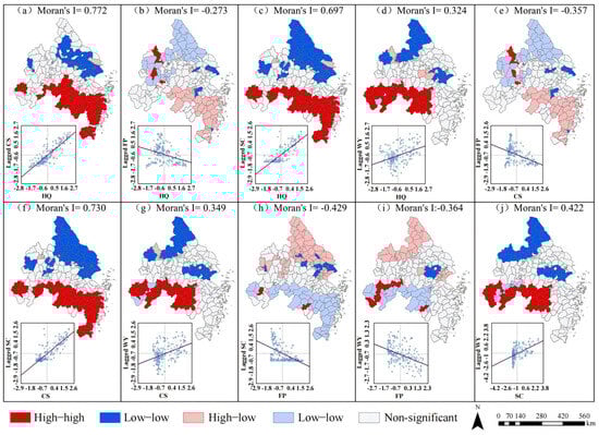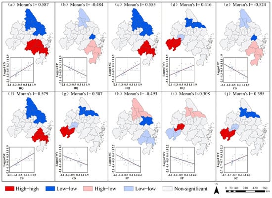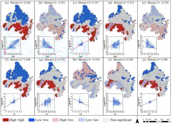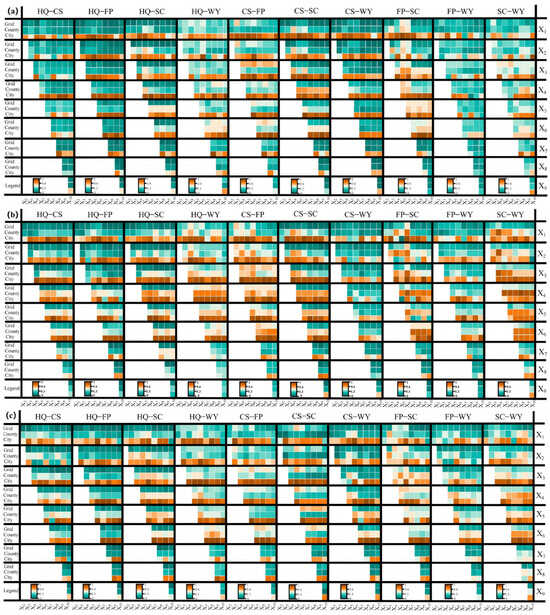 - The five ESs in this research region demonstrated significant spatiotemporal heterogeneity. HQ, CS, and FP all showed fluctuating downward trends, decreasing by 2.90%, 1.71%, and 33.95%, respectively, while SC and WY presented upward trends, increasing by 6.94% and 37.34%, respectively. High-value regions for HQ, CS, and SC were concentrated in the southern and western parts of the study area; WY exhibited a spatial pattern of being higher in the south and lower in the north, whereas FP showed the opposite distribution.