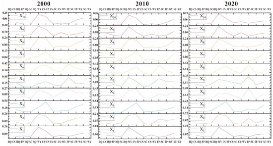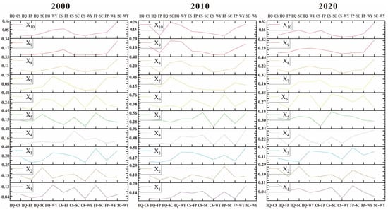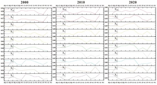 - At the grid scale, the trade-off relationship between FP and the other four ESs showed a relatively scattered spatial distribution, while the synergistic relationship among the remaining four ESs was concentrated in the northern and southern parts. Natural environmental factors exhibited relatively high single-factor explanatory power. Among them, the proportion of forestland had the strongest explanatory power for the CS–FP relationship, with its q values being 0.565, 0.539, and 0.444 in 2000, 2010, and 2020, respectively. Additionally, the single-factor explanatory power of all of the socio-economic factors exceeded 1%.