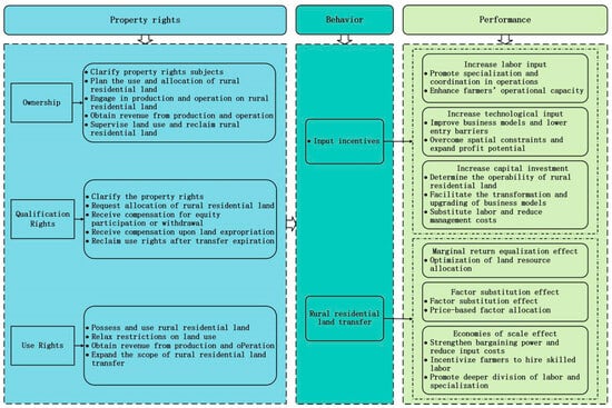 Effective institutional arrangements can define property rights, stimulate investment, and reduce transaction costs, which in turn improve economic performance [30]. The implementation of the “three rights separation” system has sparked widespread discussion on how clearer property rights can unlock the latent value of rural residential land. A prevailing view holds that clarified property rights enhance the economic value of rural residential land and increase farmers’ asset-based income [31]. However, even under the earlier “two rights separation” system, when boundaries were blurred, some farmers still managed to utilize rural residential land resources. This indicates that efficient property institutions depend not only on the delineation of rights but also on their effective implementation. The “three rights separation” reform aligns with this logic. Based on this understanding, this study constructs an analytical framework following a “property rights–behavior–performance” logic. It examines how the “three rights separation” system affects the economic efficiency of rural residential land use through property rights delineation and implementation.