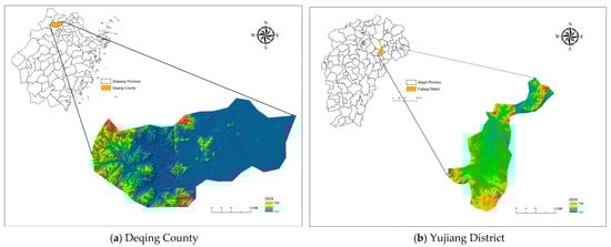 Yujiang District, located in China’s traditional central region, exhibits a moderate level of economic development and a high proportion of rural labor migration, reflecting characteristics common to much of rural China. Deqing County, situated in the economically developed eastern coastal area, also has a share of migrant workers, while some farmers actively engage in production and business activities on their homesteads. Both regions possess practical foundations for transferring or utilizing rural residential land for economic purposes. Together, their differing economic contexts and shared patterns of rural land use make them broadly representative of rural conditions in China (Figure 2).