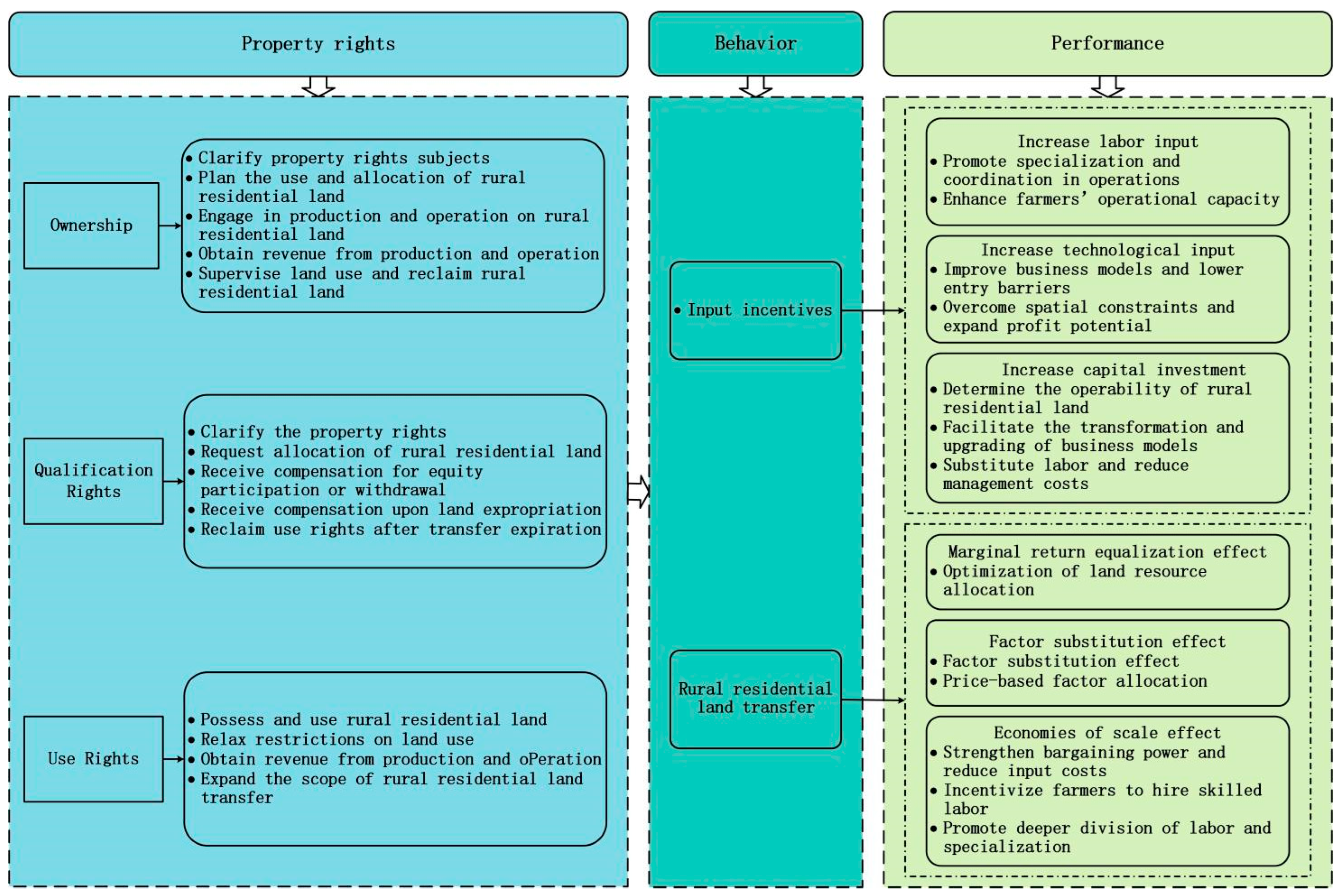 - Improving ownership. This system aims to address the weakening of the rural residential land ownership subject and explore ways to realize ownership effectively. It clarifies rural collective economic organizations as the sole holders of ownership and grants them legal authority over the planning, allocation, and adjustment of rural residential land [17]. This enhances their governance capacity in resource allocation and use efficiency [32].