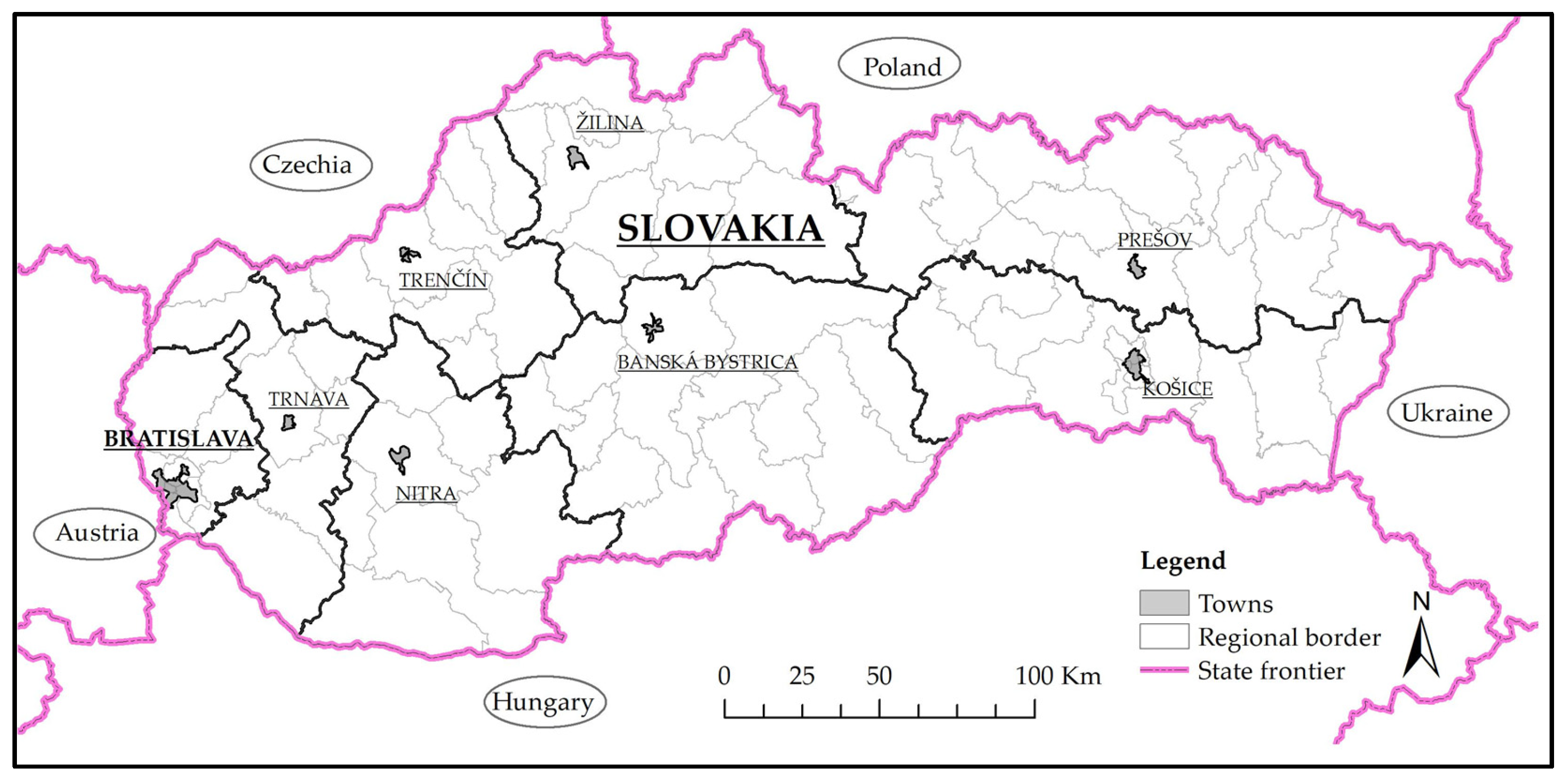 24]. These annual reports combine local records from weather stations and analyze satellite data to catalog and quantify flood damage across each of Slovakia’s eight self-governing regions incorporating raster and land cover (Corine) methodologies to determine land use classification [