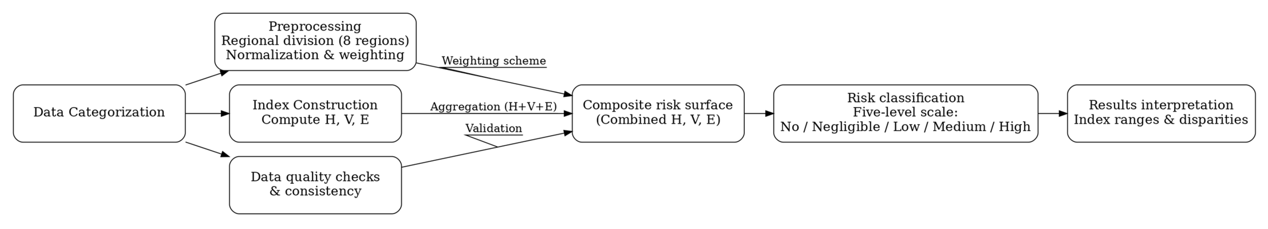 2.3. Data Collection and Processing—Hazard, Vulnerability and Exposure Indexes