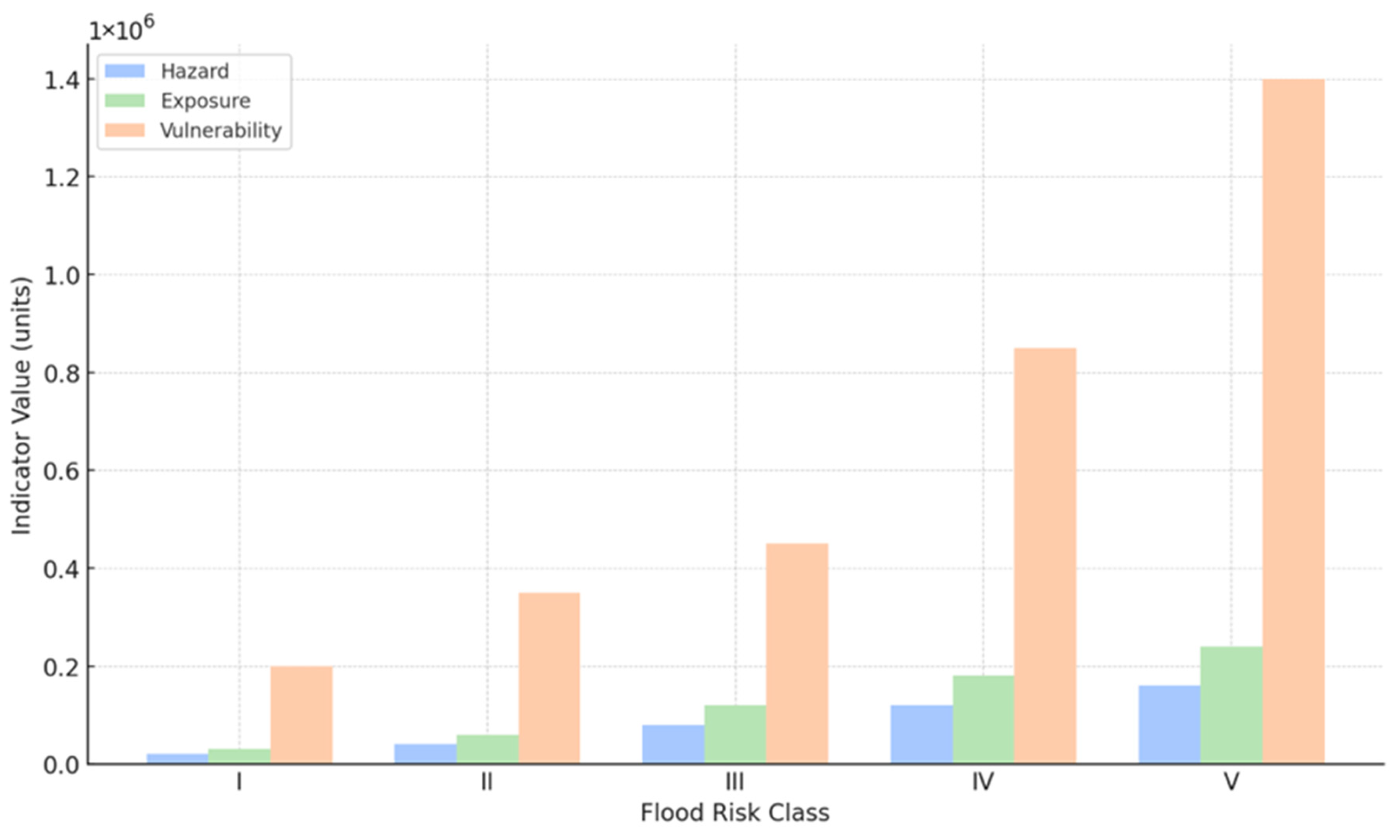 EI exposure index has a value of thirty across five indicators, the highest number in the framework: flooded residential buildings, flooded non-residential buildings, affected engineering networks, affected animals, and other—a final category of “damages” which consists of twenty-six sub-indicators. However, to ensure clarity,