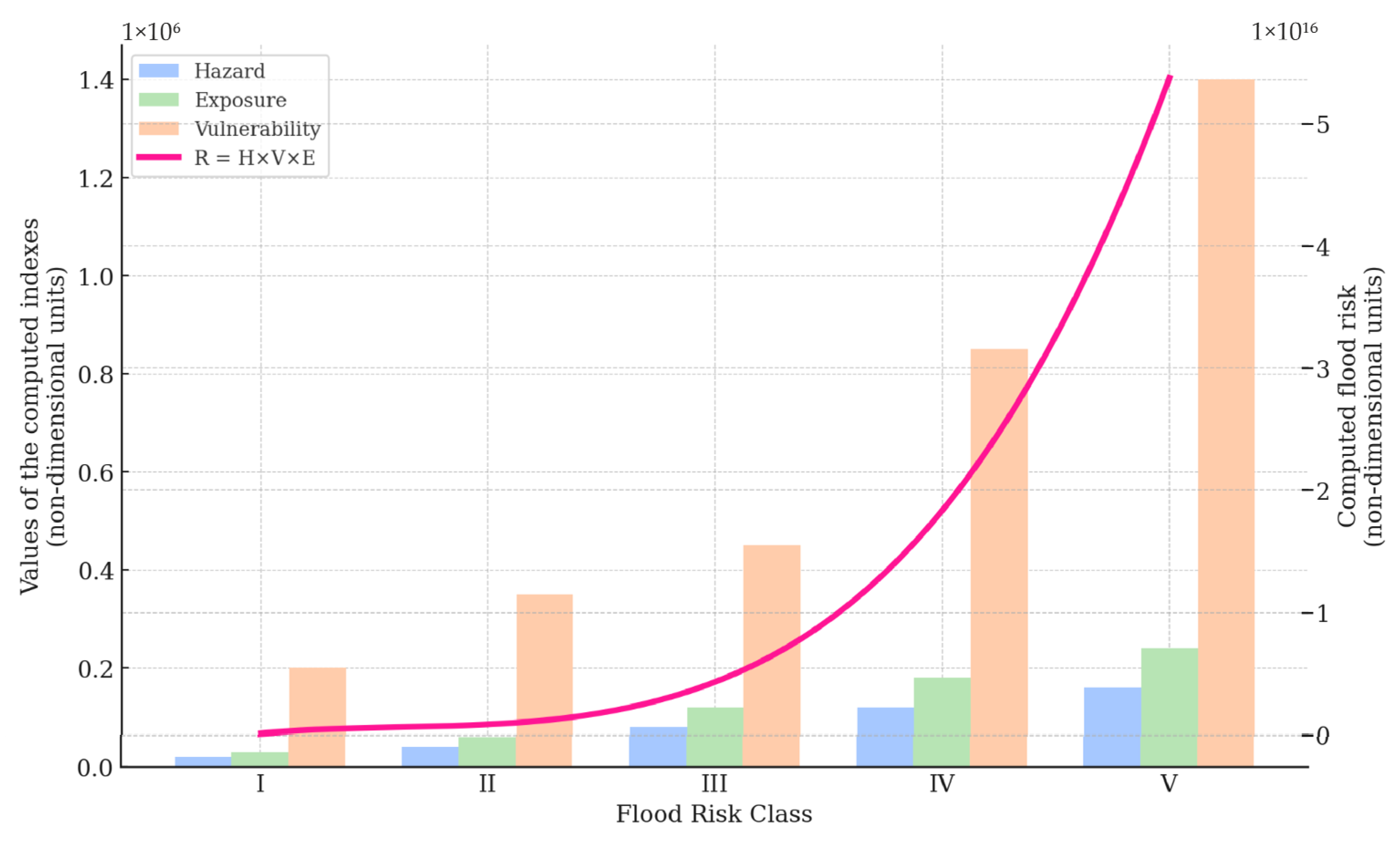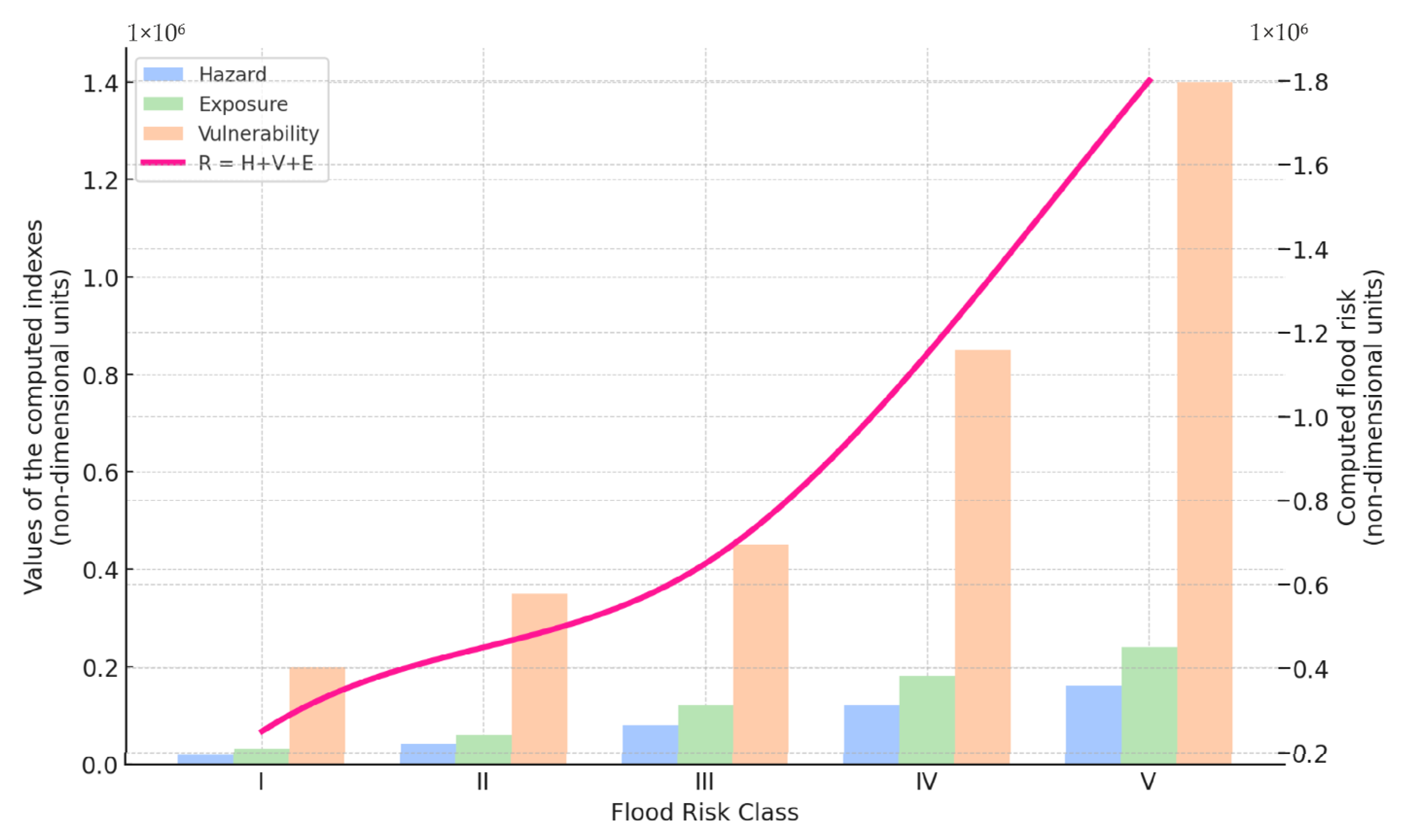 Based on Formula (1), the resulting risk will be the product of the hazard, vulnerability, and exposure indexes, and the resulting risk measure is therefore the product of the values for each risk level individually (