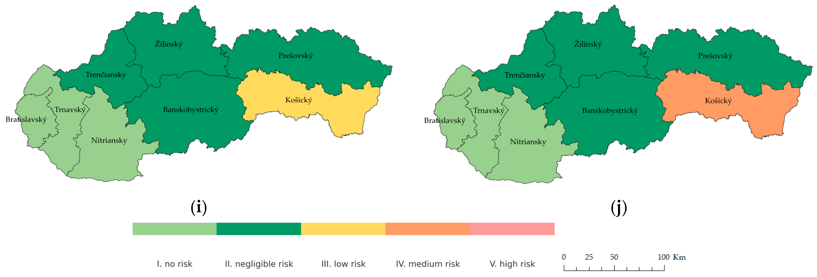 The obtained values are then integrated into a risk scale with five levels of risk: no risk, negligible risk, low risk, medium risk, and high risk. This scale was implemented for each index separately, and the final risk measure was obtained by the product of these values according to Formula (1).