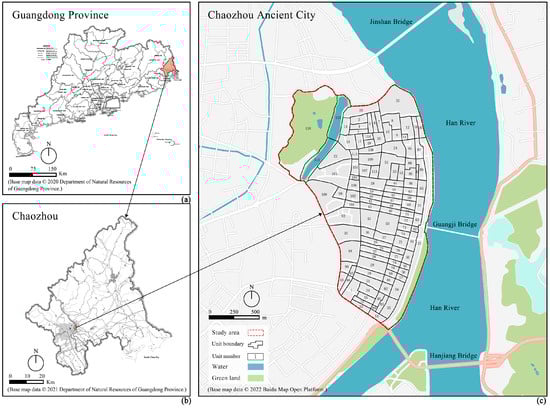 Location of Chaozhou and Chaozhou ancient city: (a) Guangdong Province (base map data © 2020 Department of Natural Resources of Guangdong Province); (b) Chaozhou (base map data © 2021 Department of Natural Resources Guangdong Province); and (c) Chaozhou ancient city (base map data © 2022 Baidu Map Open Platform).