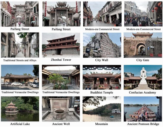 Regarding the distribution of landscape elements in the horizontal spatial dimension, according to the “layer composition” framework mentioned above (Figure 3), spatial dimension elements should include urban buildings, streets, open spaces, and other elements. Drawing on the classification of scholars such as Li Heping [30], and based on morphology and typology, the elements of ancient cities’ historic landscapes are divided into three categories: the architectural landscape, spatial place, and environmental landscape. The architectural landscape is subdivided into three types: public buildings, residential buildings, and commercial buildings. The spatial place is subdivided into two types: streets and alley spaces, and squares and courtyards. The environmental landscape is subdivided into two types: mountain forms and terrains, and water conservancy and water systems. Based on this classification system, this study places historical landscape elements on modern maps through the interpretation of historical texts and images, aiming to establish a unified spatial benchmark and lay the foundation for subsequent diachronic comparative analysis.