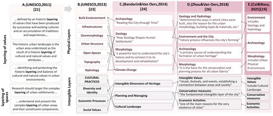 “Layering”, as a core perspective for understanding the formation and evolution of cities, has become an important theoretical concept in the field of urban heritage conservation in recent years [19]. Its core idea originates from the concept of the Historic Urban Landscape (HUL) proposed in the “Recommendation on the Historic Urban Landscape” issued by the United Nations Educational, Scientific and Cultural Organization (UNESCO) in 2011, emphasizing that urban heritage is the result of the dynamic accumulation and superposition of natural and cultural values over time [20,21]. This concept can be traced back to Ian McHarg’s “layer-cake” model proposed in ecological planning [21], which advocates viewing the city as a complex system composed of multi-dimensional and multi-layered elements interacting with each other, including environment, archaeology, morphology, intangible values, planning processes, and economic activities [22]. To emphasize the importance of the “layer” concept, UNESCO issued “New Life for Historic Cities: The Historic Urban Landscape Approach Explained” in 2013, which once again reinforced the “layer” concept and highlighted how cultural relics from different periods continue to be superimposed, accumulated, and integrated on specific spatial objects, forming a complex spatiotemporal collage [23]. The layer theory transcends the limitation of focusing solely on individual buildings or the “historic center”, extending the protection perspective to a broader urban environment and its geographical context. It serves as a foundation for understanding the interrelationships of complex urban elements and formulating effective conservation strategies [24]. Advocates of the historic urban landscape theory, Ron van Oers and Bandarin, further expanded the concept of “layering”. They contend that the layering process should encompass multiple dimensions, i.e., the material level is regarded as the “stratigraphy” of the city, while the non-material level is the core of the social dimension [25], which should include consideration of the value dimension [26]. Therefore, after reviewing previous research, it can be concluded that “layering” should include six core components [19]: environment, archaeology, morphology, intangible values, conservation measures, and economic activities, with each layer potentially containing more detailed content (Figure 3).
