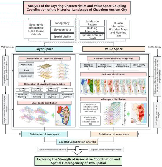 In view of this, this study takes Chaozhou Ancient City as a research case, draws on the theory of historic urban landscape layering, and constructs a two-dimensional evaluation system of “layer–value”. It comprehensively applies the interpretation of historical documents, the spatial quantitative analysis of GIS, the single-land-use dynamic degree model, the Analytic Network Process (ANP), and the Delphi method to carry out a quantitative analysis and value assessment of the historical layer space and value space of the ancient city historical landscapes. Furthermore, the spatial correlation coordination strength and spatial heterogeneity of the two are explored using the spatial autocorrelation model and coupling coordination degree model. The research aims to provide a decision-making foundation based on spatial evidence for the refined protection, adaptive renewal, and sustainable development of Chaozhou Ancient City. At the same time, the explored “quantitative spatial correlation” method model is expected to provide a generalizable scientific reference for the overall protection and living inheritance of regional cultural heritage with complex layering characteristics.
