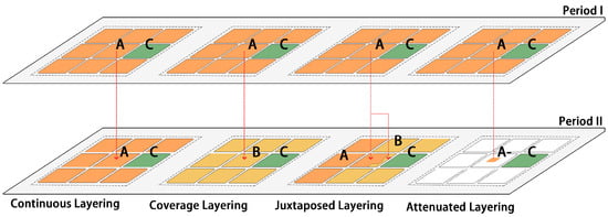 Based on the results of the calculation, the data were divided using the natural breakpoint method. At the same time, this study summarizes the existing research [32] and further refines four typical historical layering patterns: continuous layering, coverage layering, juxtaposed layering, and attenuated layering (Figure 5). The continuous type shows that the core landscape elements maintain the stability of ontological attributes and spatial correlations during the development, and the rate of change in is lowest. The coverage type reflects that the landscape elements have been completely replaced with new forms, and the rate of change in value is highest. Finally, the juxtaposed type is a small-scale fusion of the previous two types, which reflects the spatial coexistence and collage of landscape elements in multiple periods, such that the rate of change in is moderate. The attenuated type is characterized by the physical destruction and cultural rupture of landscape elements due to a lack of maintenance or functional failure; in this case, the is negative. This analysis aids our understanding of the evolutionary development of historical environments and facilitates the precise identification of layer spaces that exhibit significant historical depth and complexity.