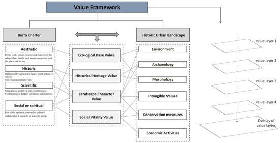 Values are defined by social relationships that produce a full variety of typologies [33]. As the origin of the Principles for the Conservation of Heritage Sites in China, the Burra charter plays an important role in contemporary heritage value research. The Burra Charter’s original four-value typology—aesthetic, historic, scientific and social—initially suits the complexity of the heritage city. But this typology lacks the proper acknowledgement of cultural or economic values, which are a fundamental part of the living condition of the city today [34]. Starting from a landscape perspective, the HUL approach broadens the focus from architectural monuments to include social, cultural and economic processes for conserving urban values. Therefore, it provides a good complement in terms of cultural and economic value.