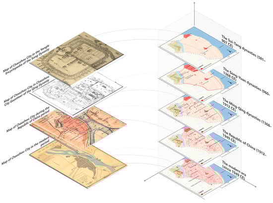 The layering of urban historical landscapes mainly unfolds along the temporal and spatial dimensions, and the collected information should not be viewed in isolation; usually, it is necessary to explore their interconnections [24]. Therefore, it should include two key axes: the distribution of landscape elements in the horizontal spatial dimension and the superposition of landscape elements in the vertical temporal dimension.