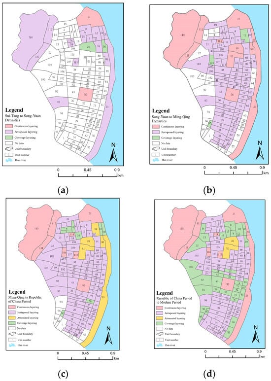 (a) Spatial distribution of layering characteristics from the Sui–Tang to Song–Yuan dynasties; (b) spatial distribution of layering characteristics from the Song–Yuan to Ming–Qing dynasties; (c) spatial distribution of layering characteristics from the Ming–Qing dynasties to Republic of China Periods; (d) spatial distribution of layering characteristics from the Republic of China to the modern era. (Source: ArcGIS Pro Screenshot, the base maps in the figure all use the core area of modern Chaozhou Ancient City as a unified spatial reference).