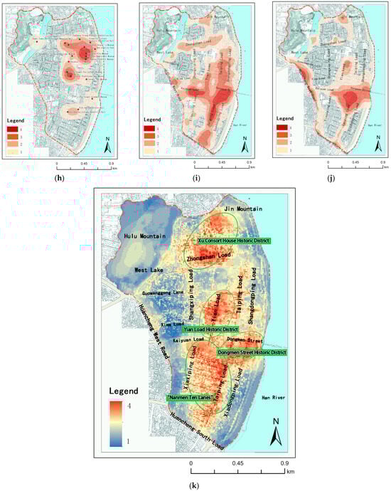 Assessment of historic landscape values in Chaozhou Ancient City; (a) represents terrain and topography; (b) represents vegetation greening; (c) represents cultural relics; (d) represents historical place; (e) represents historic districts; (f) represents architectural landscape; (g) represents streets and alleys landscape; (h) represents cultural space; (i) represents business vitality; (j) represents space vitality; (k) shows the weighted superposition result of all the above-mentioned drawings. It is used to comprehensively present the multi-factor elements such as terrain and vegetation in the study area and the overall characteristics after superposition, providing basic data support for subsequent analysis. (Source: ArcGIS Pro Screenshot, the base maps in the figure all use the core area of modern Chaozhou Ancient City as a unified spatial reference).